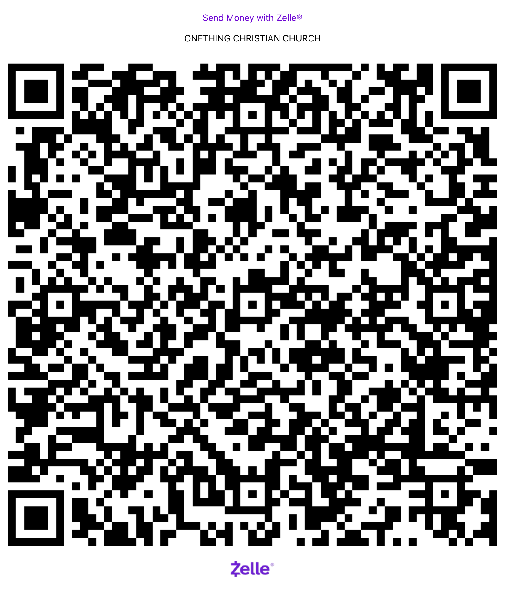 在Zelle上輸入電郵號碼 prayer@onethingcc.org 或掃描本頁面上的 Zelle 二維碼, 可直接轉賬至Onething基督教會。